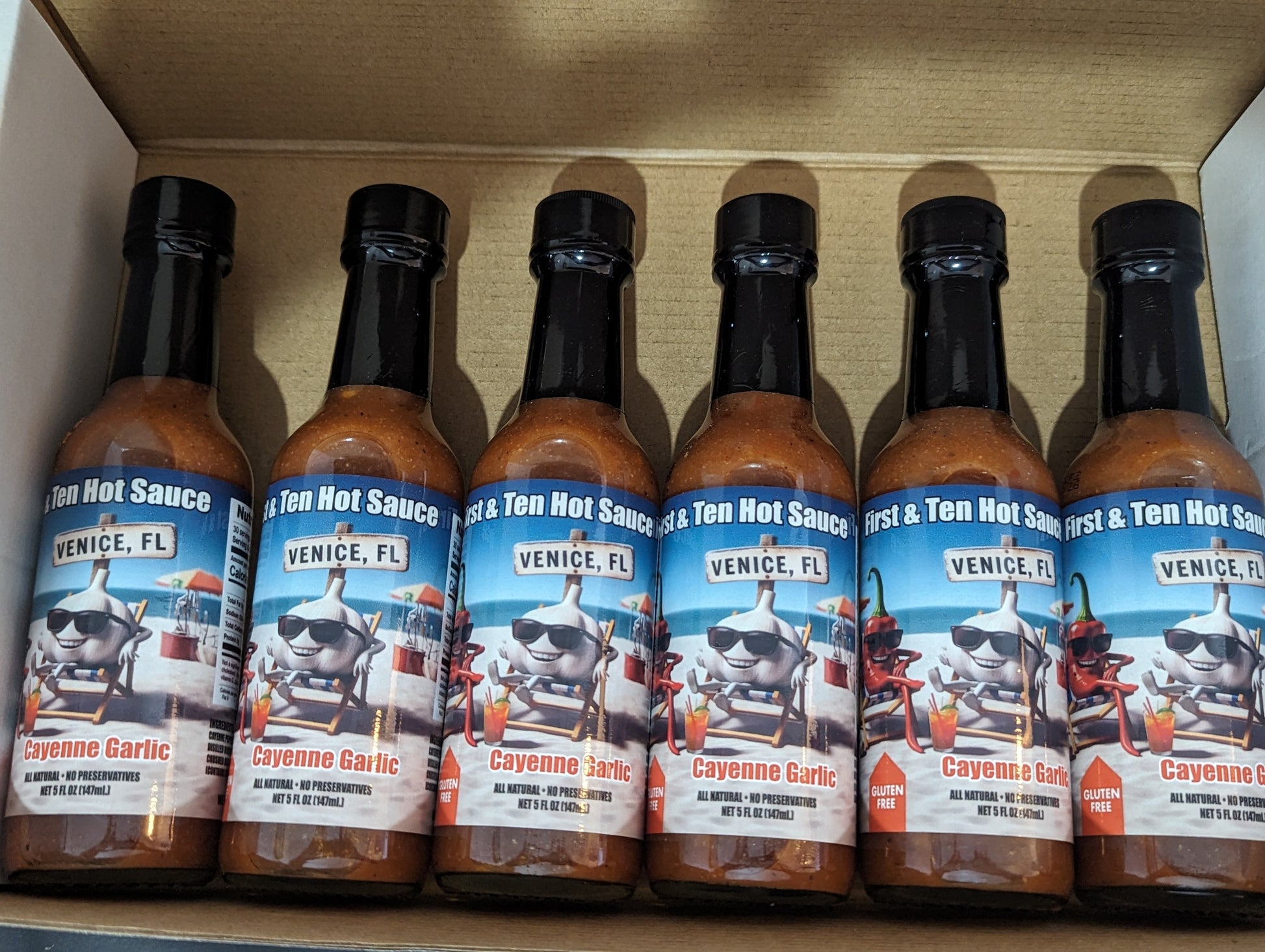 6 pack of First & Ten original Cayenne Garlic Hot Sauce 5oz Bottles.
